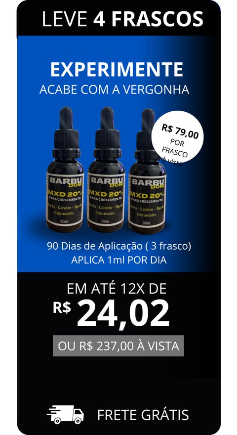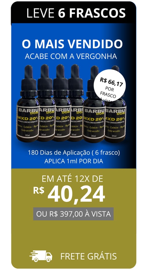 Descubra como o tônico Barbudom MXD 20% pode transformar sua vida, ajudando você a recuperar a confiança e a beleza dos seus cabelos e aumentar sua barba. Os primeiros resultados aparecem a partir da 3ª semana de uso! Diferente de produtos que demoram meses ou nem funcionam, Barbu Dom MXD 20% entrega resultados reais em tempo recorde!